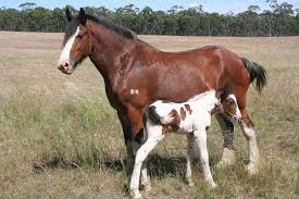 The most obvious characteristic is their large frying pan sized hooves and luxurious leg feather. Many Clydesdales have flashy colouring, with white facial markings and four white legs. They are high stepping at both the walk and trot.